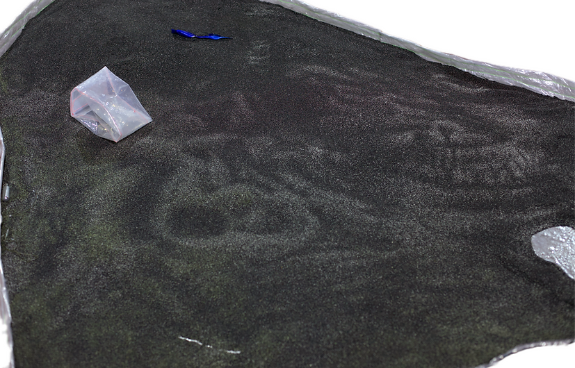 Rita Beach - 2024 - Contents of used Brita filters (sand), clay, glass, mirror, tin, plastic, thread, aqueous residues - 350 x 200 x 50 cm